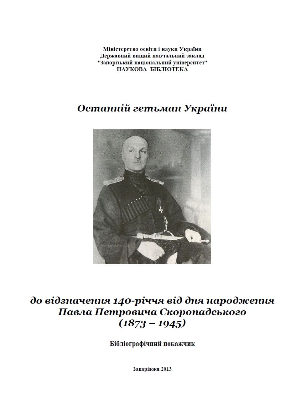 До відзначення 140-річчя від дня народження гетьмана України Павла Петровича Скоропадського Наукова бібліотека ЗНУ підготувала бібліографічний покажчик публікацій з фонду наукової бібліотеки ЗНУ, присвячений його життю та діяльності. Окремі розділи покажчика присвячені публікаціям про громадсько-політичну та законотворчу діяльність гетьмана П.Скоропадського. До бібліографічного покажчика ввійшли статті з періодичних видань, наукових збірників, книги. Окремий розділ склали електронні ресурси інтернет-сайтів. Покажчик створено на базі електронного каталогу за період 2000-2013 рр., алфавітного та систематичного каталогів, систематичної картотеки статей станом на 1.05.2013. Місце зберігання джерел - фонди та електронні колекції наукової бібліотеки ЗНУ.