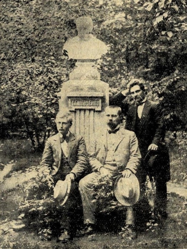 Л. Мацієвич, М. Міхновський та актор С. Паньківський біля першого в Україні пам’ятника Т. Шевченку у Харкові. Фото: Львівська національна наукова бібліотека ім. Стефаника