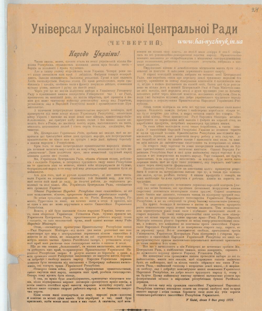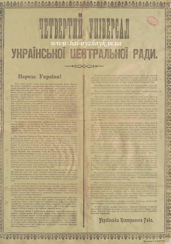 Але для того, щоб ні руське правительство, ні яке инше не ставили Україні на перешкоді установити той бажаний мир, для того, щоб вести свій край до ладу, творчої роботи, до кріплення революції та волі нашої, ми, Українська Центральна Рада, оповіщаємо всіх громадян України: