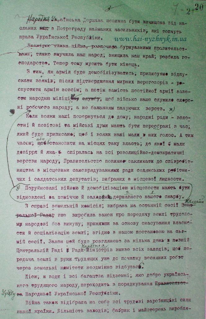 Що ж до так званих "большевиків" та инших напастників, що нищать та руйнують наш край, то приписуємо Правительству Української Народньої Республіки твердо й рішуче взятися за боротьбу з ними, а всіх громадян нашої Республіки закликаємо: не жаліючи життя боронити добробут і свободу нашого народу. Народня Українська Держава повинна бути вичищена від насланих з Петрограду найманих насильників, які топчуть права Української Республіки.