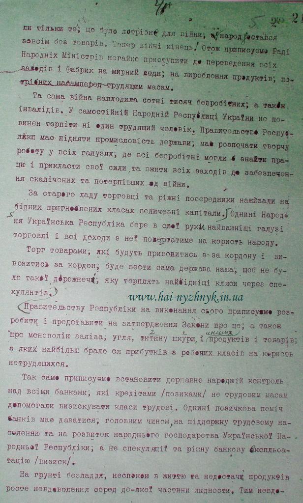 Так само приписуємо встановити державно-народній контроль над всіми банками, які кредітами (позиками) нетрудовим масам допомагали визискувати кляси трудові. Однині позичкова поміч банків має даватися головним чино на піддержку трудовому населенню та на розвиток народнього господарства Української Народньої Республіки, а не спекуляції та ріжну банкову експльоатацію (визиск).