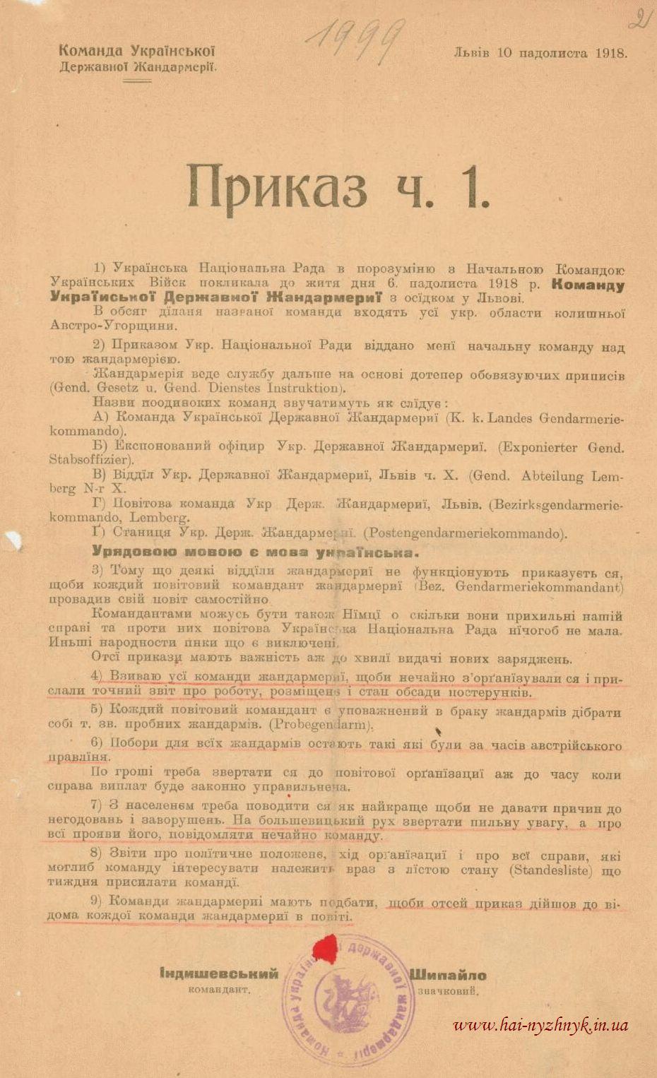 10 листопада 1918 р. - Наказ Ч. 1 державної жандармерії ЗУНР