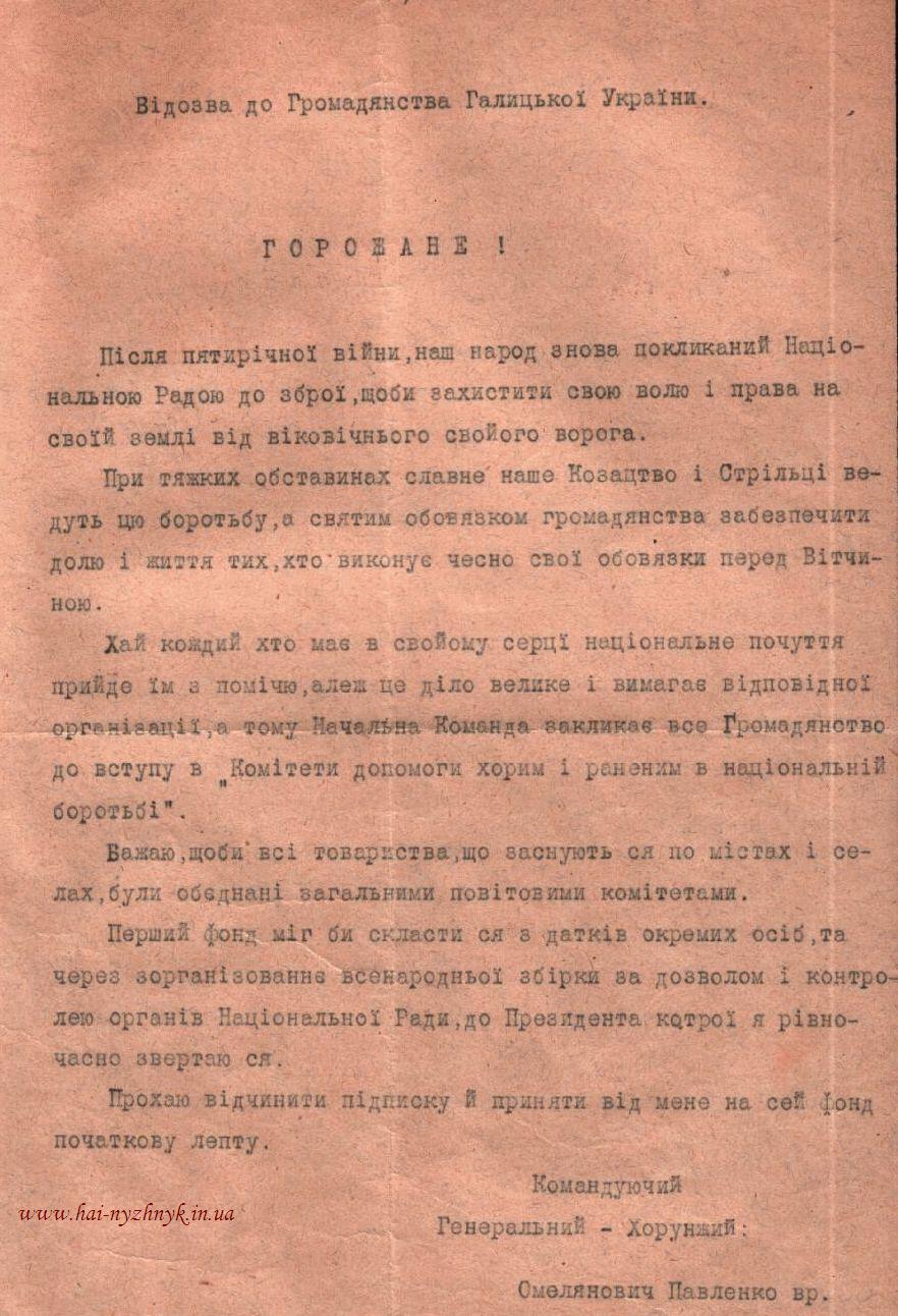 М.Омеляновича-Павленка до громадян Галицької України про створення комітетів допомоги та збір коштів для Української Галицької Армії]