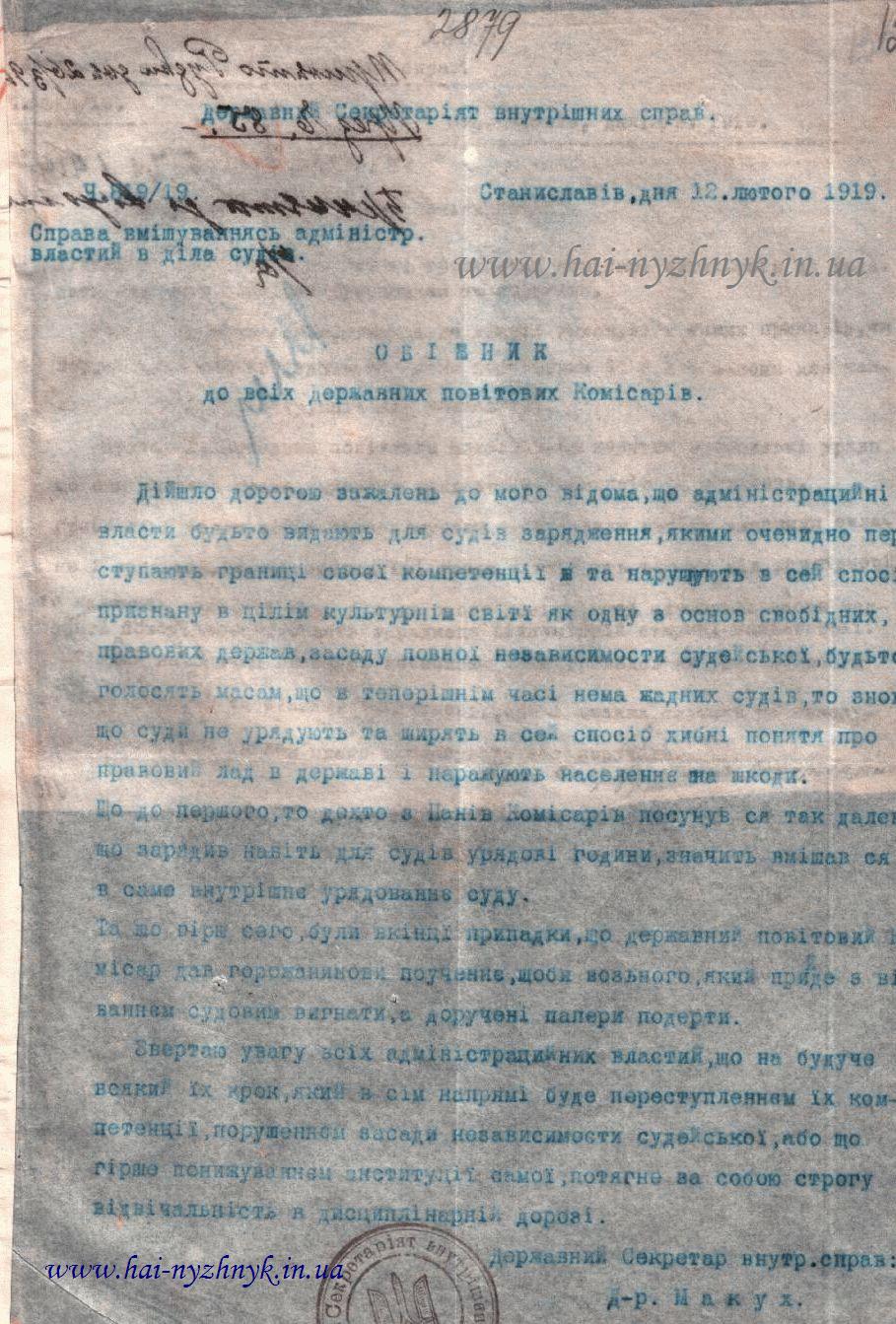 ![12 лютого 1919 р. - Обіжник до всіх державних повітових комісарів. Справа вмішування адміністративних властей в діла судів (Ч. 819/19.) [державний секретар внутрішніх справ І.Макух]](zobrazennya/1919 (02) 12.nezaleznyi sud.jpg)