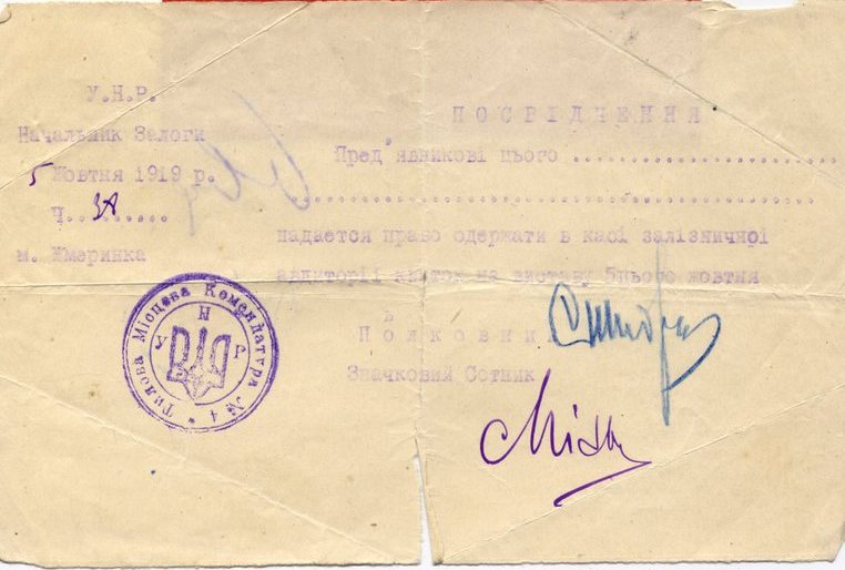 5 жовтня 1919 р. Бланк посвідчення на видачу (Тилова комендатура УГА)