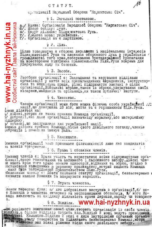 Січень 1939 р. - Статут Організації Народньої Оборони «Карпатська Січ». (Карпатська Січ, «Карпатська Січ», Статут Карпатської Січі, Карпатська Україна, 1939)