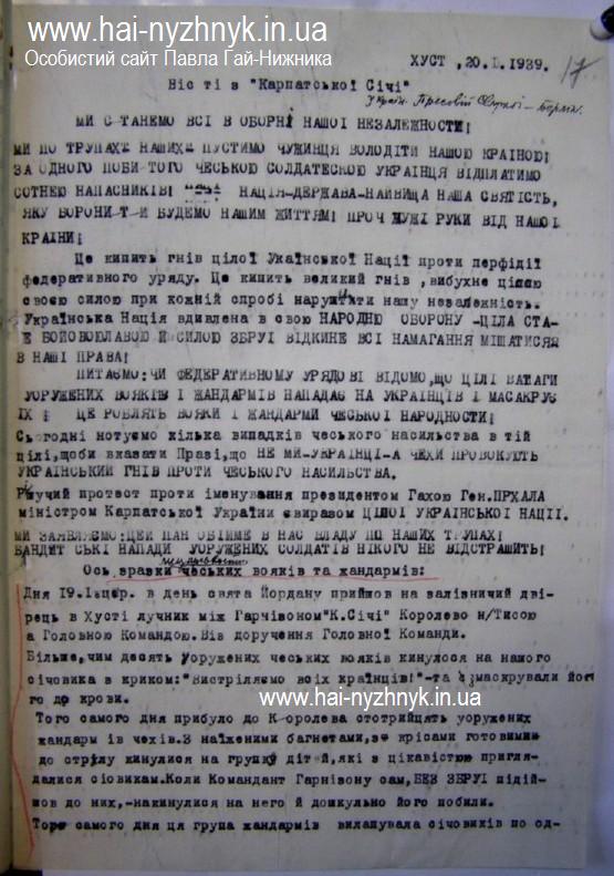 Повідомлення Організації Народної оборони «Карпатська Січ» (Хуст), передане для преси щодо готовності стати до оборони незалежності країни