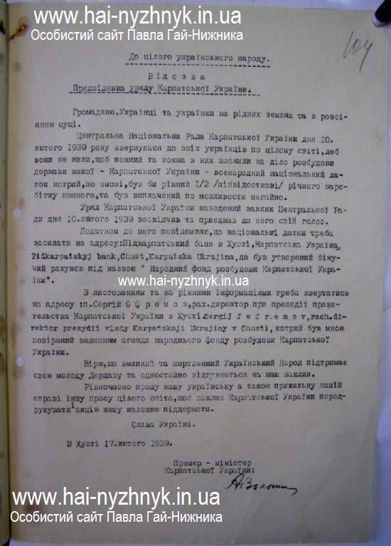 Відозва Прем’єр-міністра Карпатської України А.Волошина до українського народу про національний податок для розбудови Карпатської України (м. Хуст)