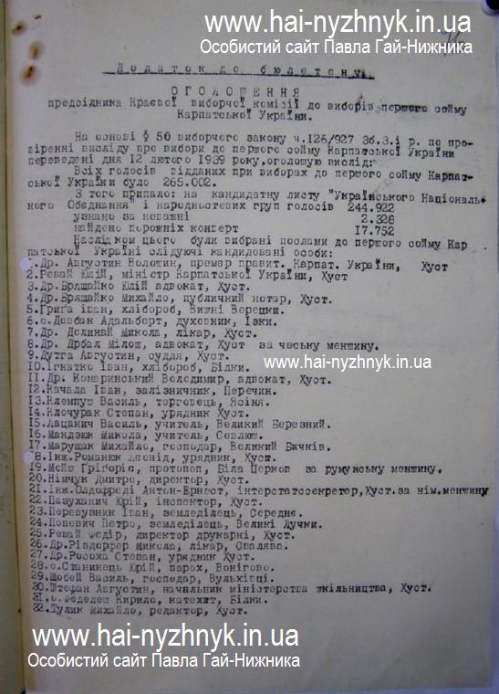 Додаток до бюлетеня Пресової служби Карпатської України з оголошенням предсідника Краєвої виборчої комісії до виборів першого сойму Карпатської України