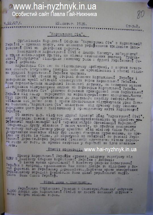 Повідомлення бюлетеня Пресової служби Карпатської України про Організацію Народної Оборони «Карпатська Січ», події в Карпатській Україні