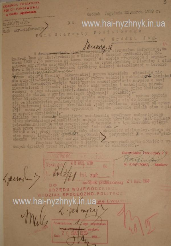 Доповідь коменданта повітової управи поліції у Городку-Ягелонському про настрої серед місцевого українського населення з приводу окупації угорцями Карпатської України