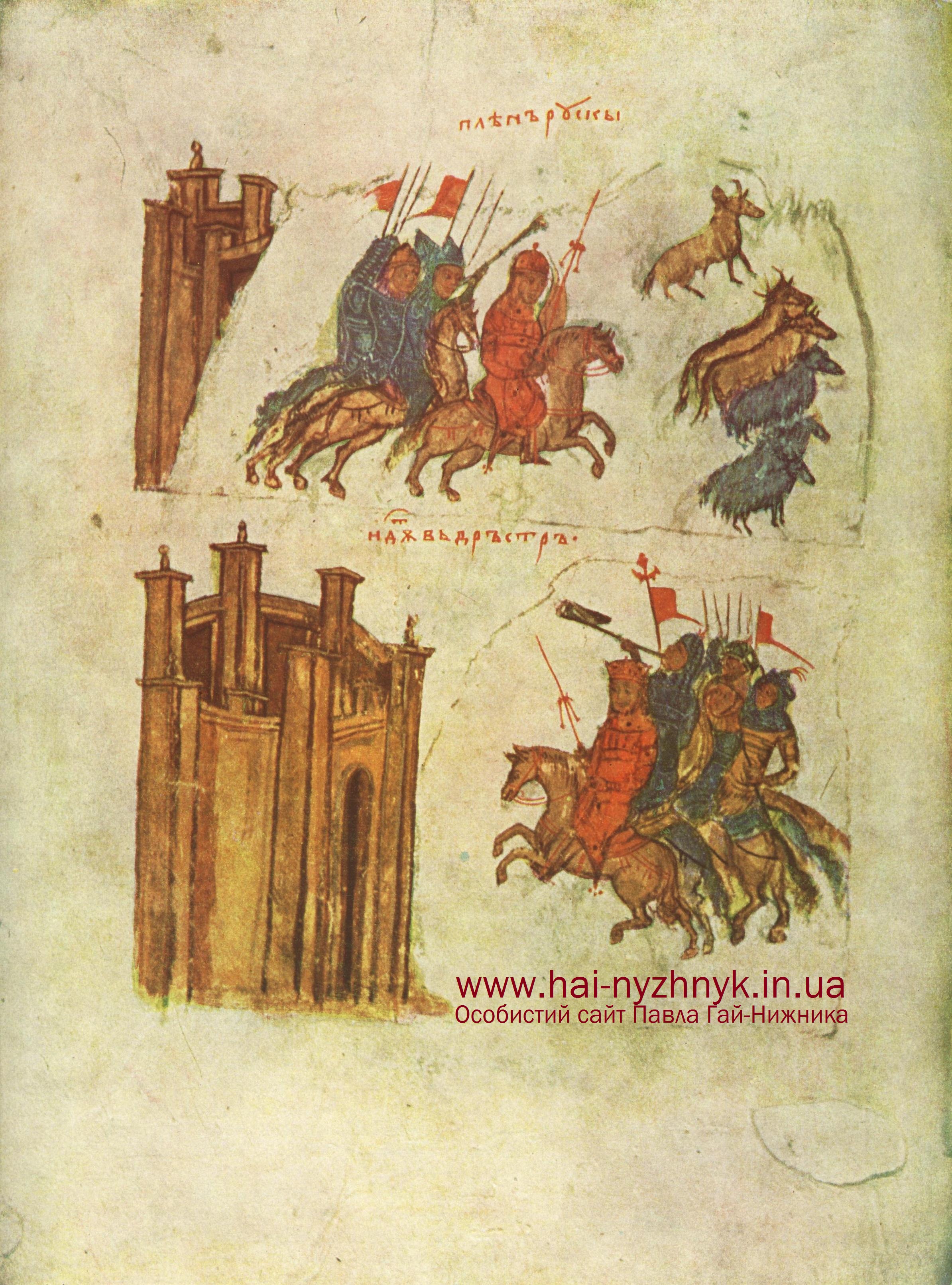 Мініатюра з Ватиканського манускрипта XIV ст. (хроніка ХІІ ст. Костянтина Манассія). Зверху зображено завоювання Святославом Болгарії, знизу — похід Іоанна Цимісхія на Доростол.